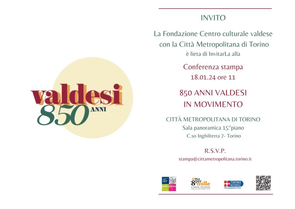 Le iniziative del programma “Valdesi 850 anni”, cheproseguiranno sino al 26 ottobre,hanno ottenuto il patrocinio della Città metropolitana di Torinoe sarà proprio la sala panoramica al 15° pianodella sede di corso Inghilterra 7ad ospitare laconferenza stampa di presentazione delle iniziative, in programma giovedì 18 gennaio alle 11.