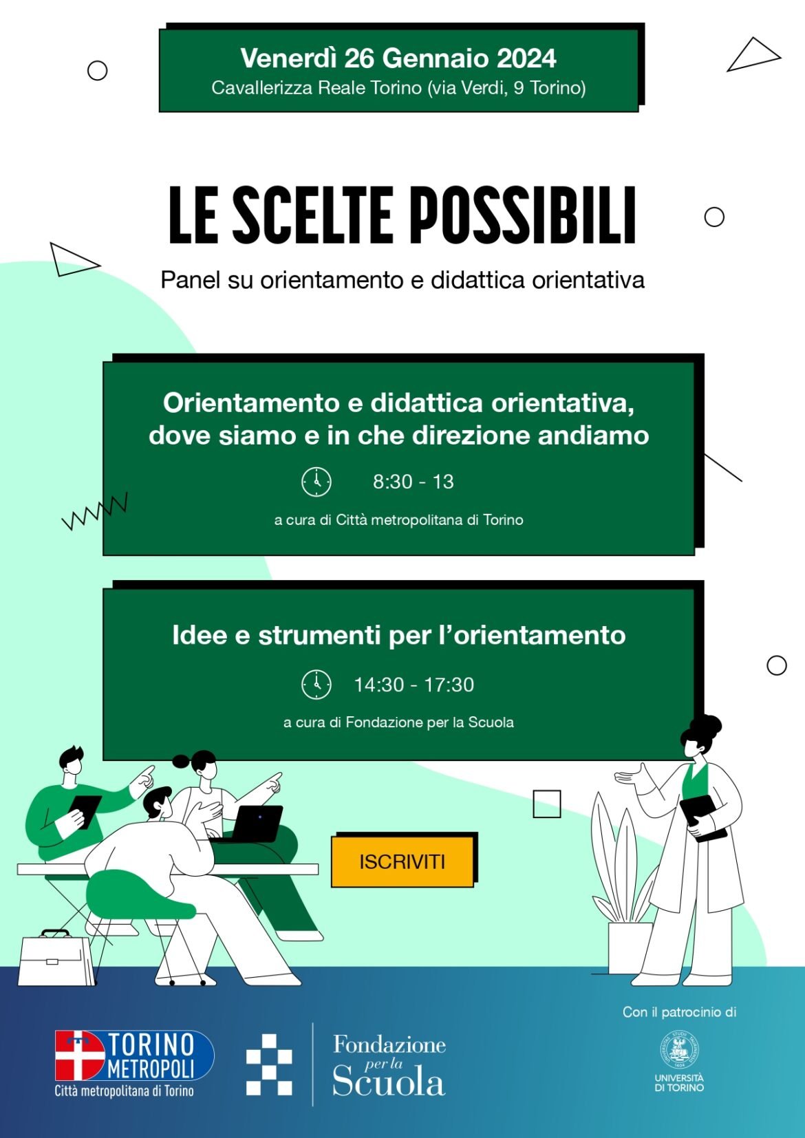 L’orientamento è un investimento fondamentale per educare le nuove generazioni ad affrontare la complessità del mondo che cambia e richiede l’impegno di tutta la comunità educante nel dotarsi di conoscenze e strumenti necessari ad accompagnare ragazze e ragazzi nei delicati momenti di transizione. Èsulla base di questi presupposti che Città metropolitana di Torinoe Fondazione per la Scuola della Compagnia di San Paolo, con il patrocinio dell’Università degli Studi di Torino, hanno organizzato Le scelte possibili. Panel su orientamento e didattica orientativa, un evento per discutere e riflettere insieme sulla complessità dell’orientamento a partire dalle molteplici prospettive che lo compongono: dispersione scolastica, importanza della scelta, orientamento narrativo, sinergia scuola-impresa, formazione docenti.