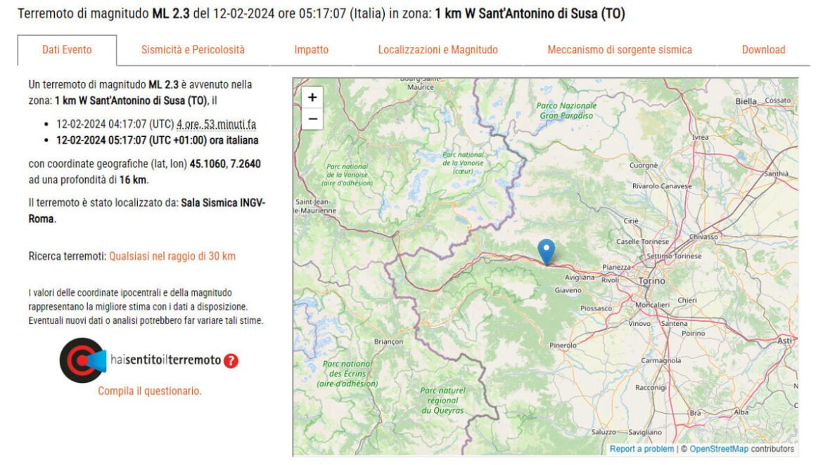 Una nuova scossa di terremoto è stata registrata in bassa valle di Susa nella notte di oggi, lunedì 12 febbraio 2024, dopo quella registrata nel pomeriggio di ieri, domenica 11, dai sismografi dell’Istituto nazionale di geofisica e vulcanologia. In questa occasione la terra ha tremato alle 5.17…Read More
