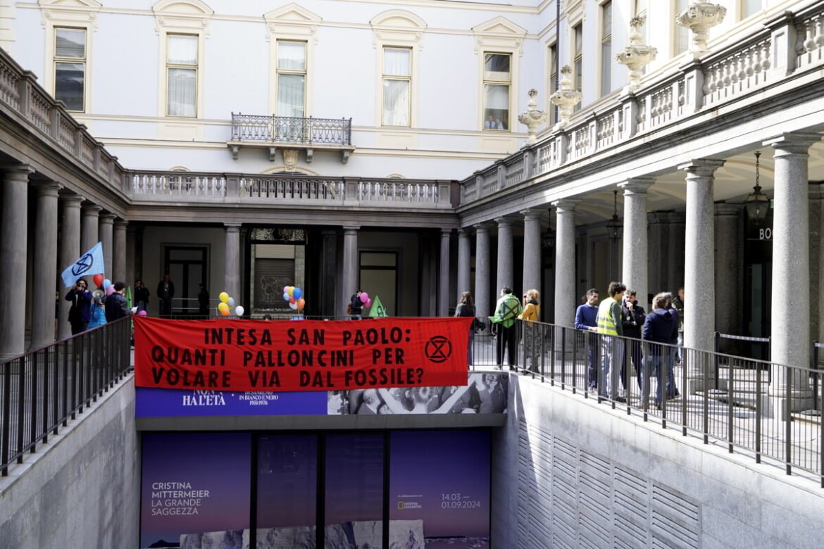 Blitz degli ambientalisti in centro, mercoledì 24 aprile. Nel pomeriggio, una ventina di persone legate a Extinction Rebellion hanno occupato le Gallerie d’Italia di Piazza San Carlo, museo di Intesa Sanpaolo, dove hanno steso a terra drappi neri ed esposto un mappamondo a cui sono stati legati…Read More