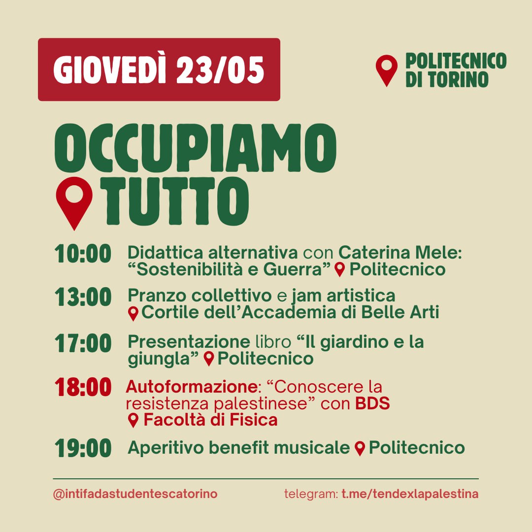 Gli studenti proseguono la protesta contro le aziende collaboratrici con il Politecnico di Torino coinvolte nell’industria della guerra. Oggi la loro determinazione si fa ancora più ferrea vista la riunione della Conferenza dei Rettori delle Università Italiane (CRUI) che si svolgerà in giornata a Roma per decidere come reprimere al meglio le occupazioni studentesche per la Palestina, che sono ormai diffuse in tutti gli atenei d’Italia.