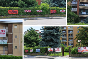 Decine di cartelli e striscioni dei residenti per urlare la propria opposizione al nuovo impianto a energia termica