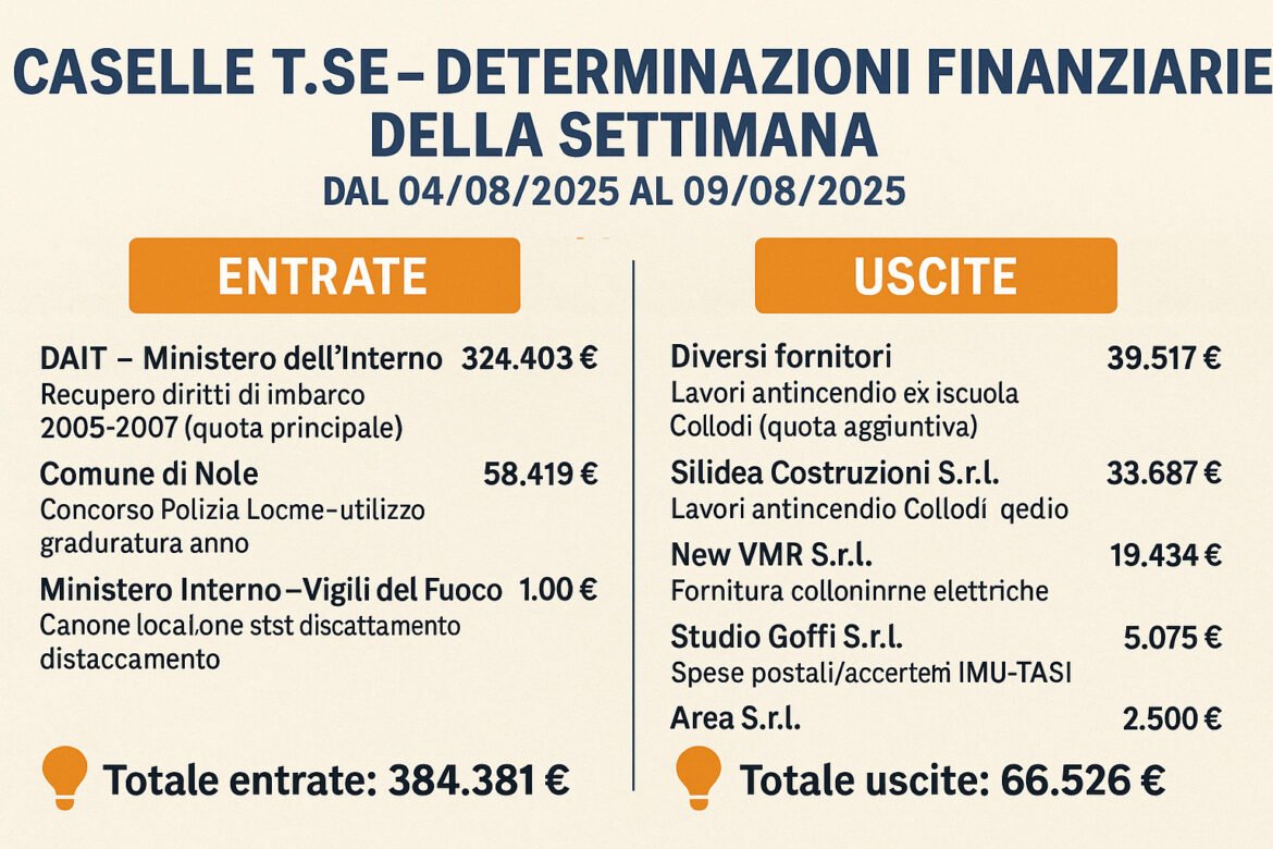 Ogni settimana il Comune pubblica atti che raccontano, nero su bianco, come entrano e come escono i soldi dalle casse comunali. Sono documenti ufficiali, pieni di codici, sigle e riferimenti normativi, ma dentro c’è la vita della città: strade, scuole, progetti, servizi… e soprattutto le nostre tasse.