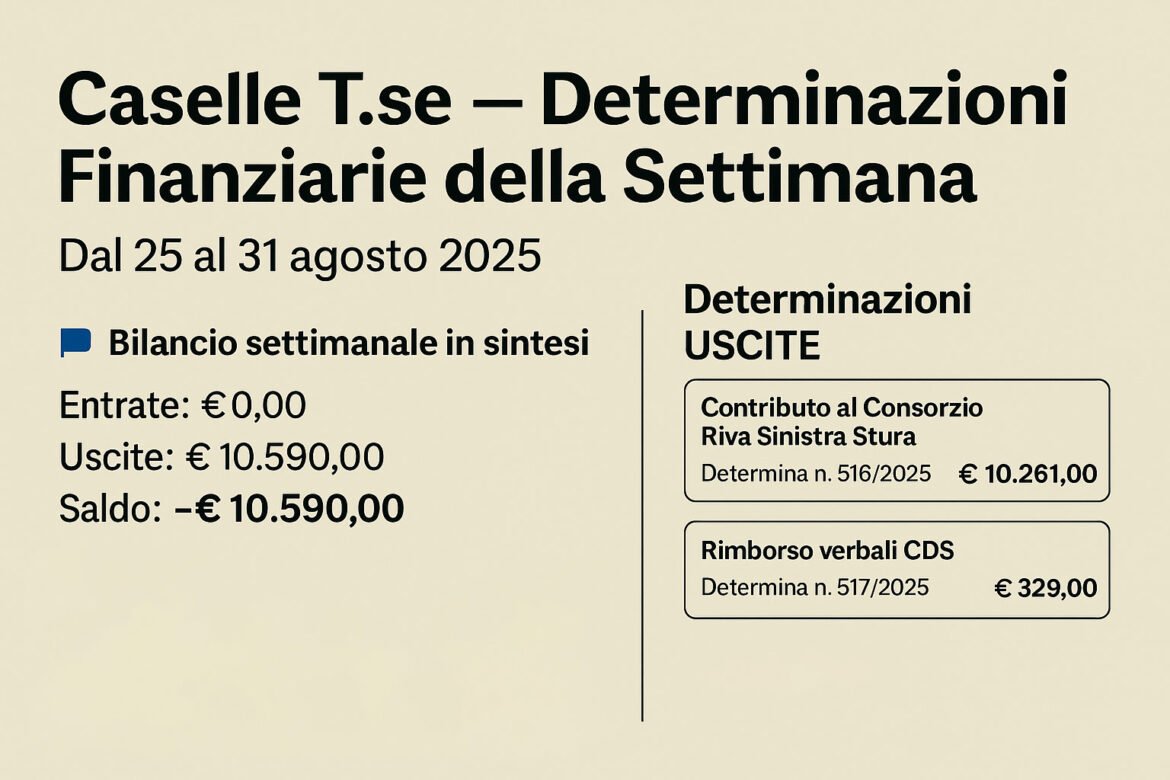 Tra il 25 e il 31 agosto, infatti, non sono stati registrati incassi, mentre le uscite hanno raggiunto 10.590,00 €, trainate soprattutto da un unico, ingombrante capitolo: il contributo al Consorzio Riva Sinistra Stura.