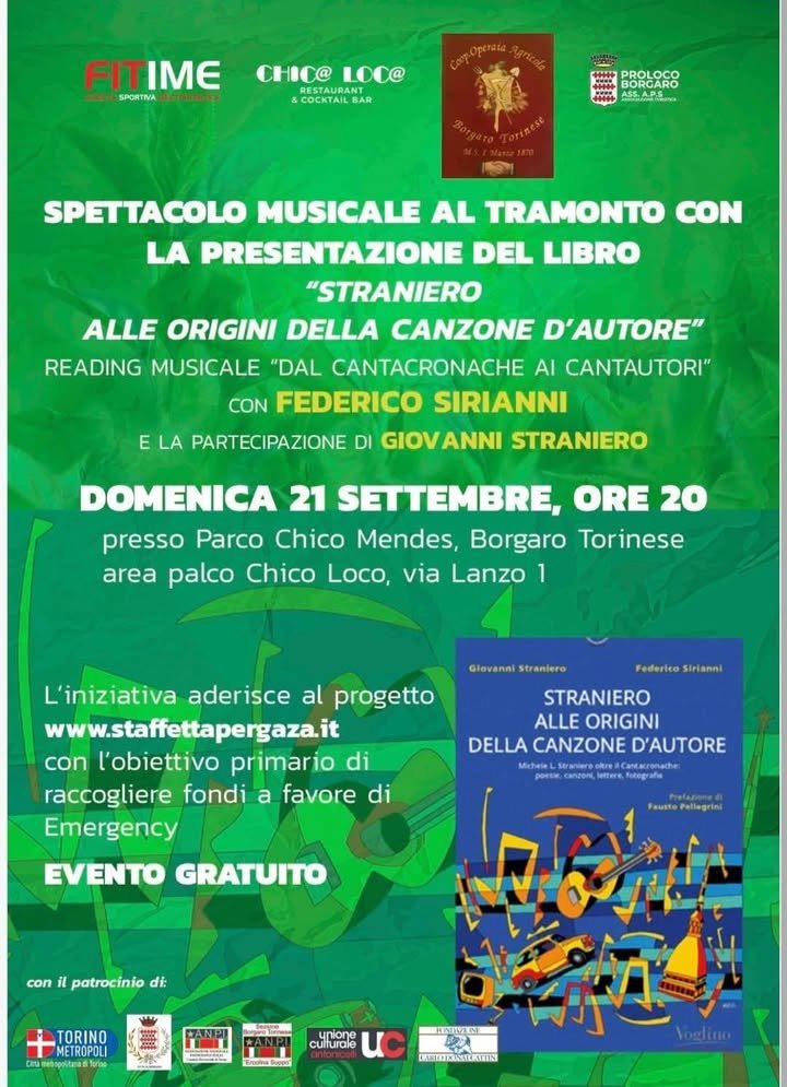 Domenica 21 settembre alle ore 20, al Parco Chico Mendes di Borgaro (area Chico Loco), vi aspetta uno spettacolo al tramonto con la presentazione del libro “Straniero. Alle origini della canzone d’autore”.