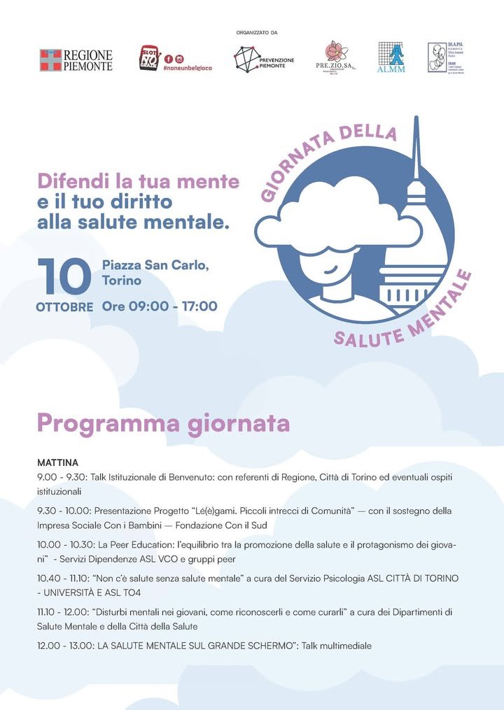 A Torino, in piazza San Carlo, dalle 9 alle 17, è in programma un evento dal titolo “Difendi la tua mente e il tuo diritto alla salute mentale”, organizzato in collaborazione con l’Associazione per la lotta contro le malattie mentali onlus, l’associazione Preziosa Ets e Diapsi Piemonte ODV.
