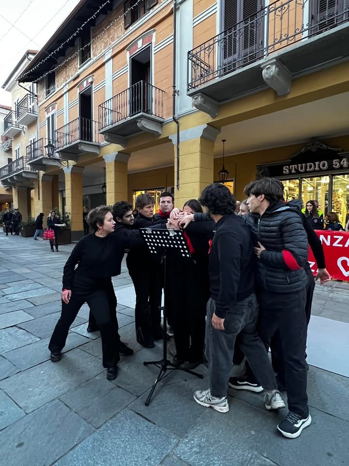 Chi era all’incrocio con via Fiera verso le 16.30 non avrà potuto fare a meno di rimanere scosso dagli atteggiamenti verbali e fisici di aggressione verso il mondo femminile, riprodotti per l’occasione e trasformati in danza, in teatro, in performance.