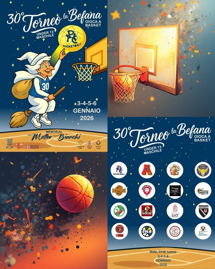 La magia della Befana torna a colorare i campi di #pallacanestro: da sabato 3 gennaio a martedì 6 gennaio 2026, Ciriè, Nole e Lanzo ospiteranno la 30° edizione del Torneo 𝐋𝐚 𝐁𝐞𝐟𝐚𝐧𝐚 𝐠𝐢𝐨𝐜𝐚 𝐚 𝐁𝐚𝐬𝐤𝐞𝐭, organizzato da PNC Basket Pallacanestro Nole Ciriè