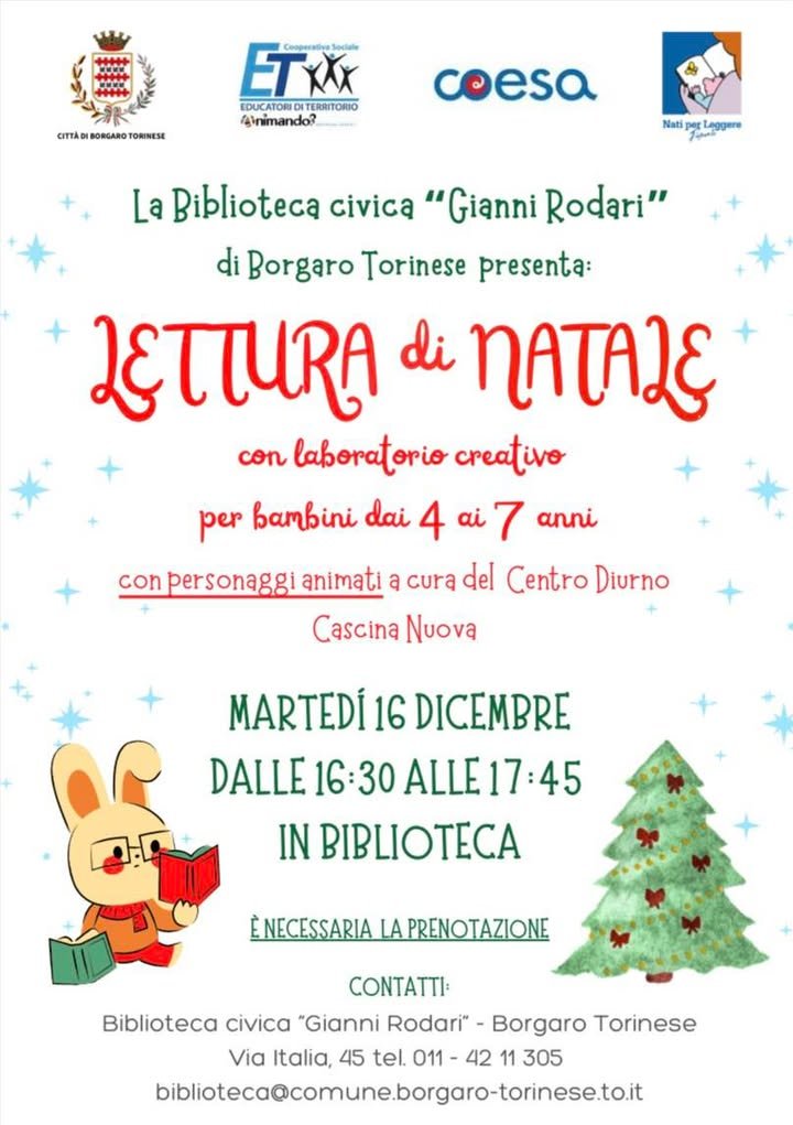 Martedì 16 dicembre, dalle 16.30 alle 17.45, la Biblioteca Gianni Rodari aspetta bambine e bambini dai 4 ai 7 anni per una lettura animata di Natale, con laboratorio creativo, insieme ai personaggi del Centro Diurno Cascina Nuova.