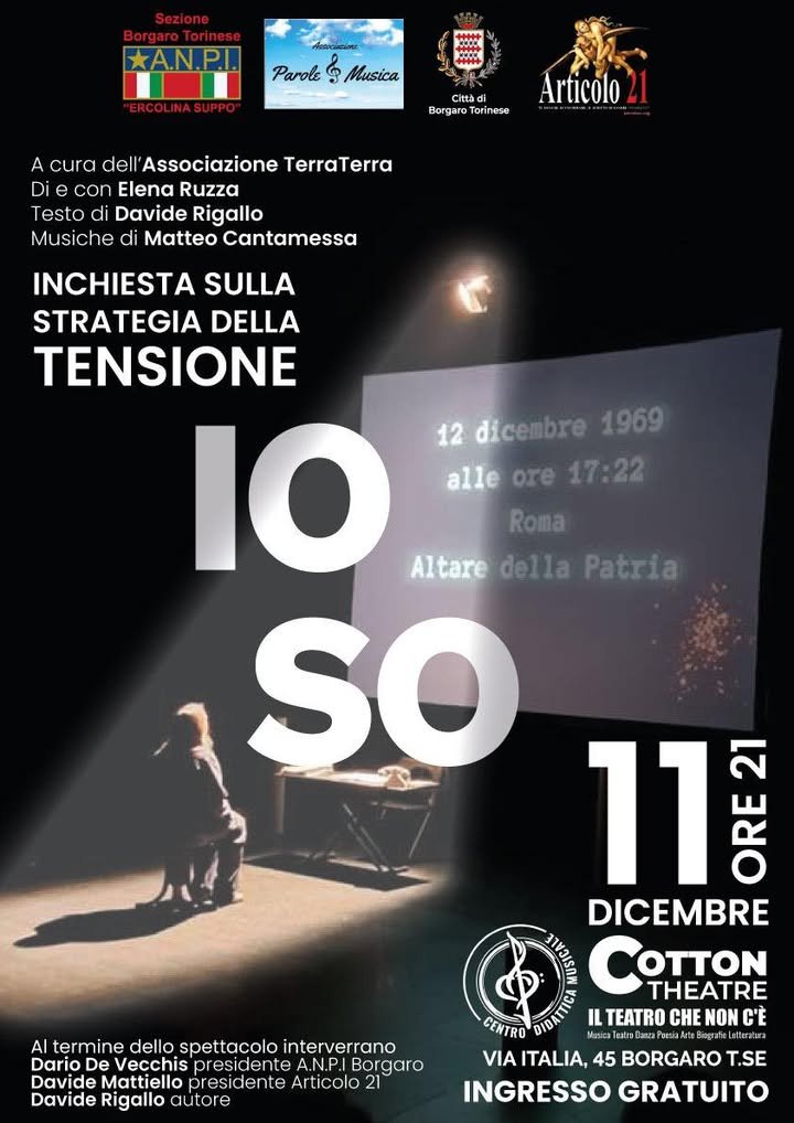 Questa sera, ore 21, al Cotton Theatre, vi aspettiamo per “IO SO – Inchiesta sulla strategia della tensione”, uno spettacolo intenso che porta sul palco memoria, coraggio e domande ancora aperte sulla nostra storia recente.