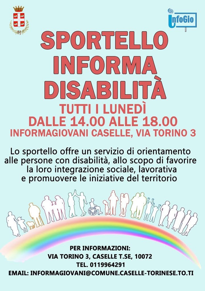 A Caselle Torinese è attivo uno Sportello Informa Disabilità, un servizio gratuito di orientamento alle persone con disabilità allo scopo di favorire la loro integrazione sociale, lavorativa e promuovere le iniziative del territorio.
