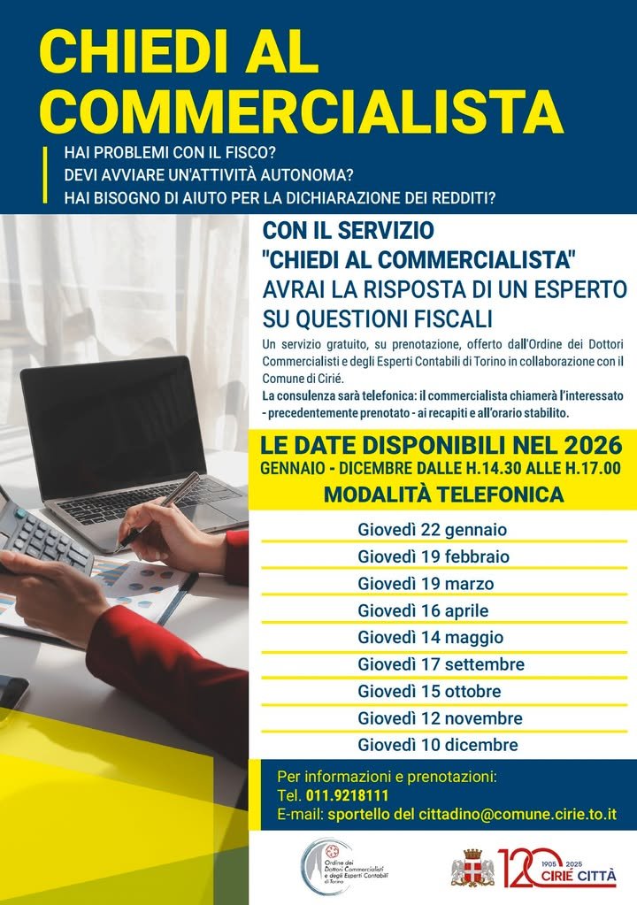 Confermato anche per il nuovo anno il servizio gratuito ๐‚๐ก๐ข๐ž๐๐ข ๐š๐ฅ ๐œ๐จ๐ฆ๐ฆ๐ž๐ซ๐œ๐ข๐š๐ฅ๐ข๐ฌ๐ญ๐š, lo sportello di #consulenzagratuita offerto presso lo Sportello del Cittadino della Cittร  di Ciriรฉ dall’Ordine dei Dottori Commercialisti ed Esperti Contabili di Torino.