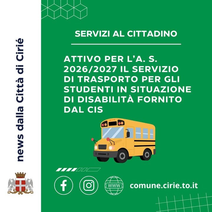 Il #CIS – Consorzio Intercomunale dei Servizi Socio Assistenziali (che copre un ampio territorio, di cui anche il Comune di Cirié fa parte) comunica che, su delega della Città metropolitana di Torino , svolgerà il servizio di #trasportoscolastico per gli studenti in situazione di disabilità in possesso della 𝐜𝐞𝐫𝐭𝐢𝐟𝐢𝐜𝐚𝐳𝐢𝐨𝐧𝐞 𝐚𝐢 𝐬𝐞𝐧𝐬𝐢 𝐝𝐞𝐥𝐥𝐚 𝐋𝐞𝐠𝐠𝐞 𝟏𝟎𝟒/𝟗𝟐 (handicap in situazione di gravità) per gli studenti frequentanti la scuola secondaria di secondo grado e corsi IeFP per 𝐥’𝐚𝐧𝐧𝐨 𝐬𝐜𝐨𝐥𝐚𝐬𝐭𝐢𝐜𝐨 𝟐𝟎𝟐𝟔-𝟐𝟎𝟐𝟕 che siano 𝐫𝐞𝐬𝐢𝐝𝐞𝐧𝐭𝐢 𝐚𝐥𝐥’𝐢𝐧𝐭𝐞𝐫𝐧𝐨 𝐝𝐞𝐥 𝐭𝐞𝐫𝐫𝐢𝐭𝐨𝐫𝐢𝐨 𝐝𝐞𝐥 𝐂𝐈𝐒 e abbiano attivato un percorso di studi 𝐩𝐫𝐞𝐬𝐬𝐨 𝐮𝐧𝐚 𝐬𝐜𝐮𝐨𝐥𝐚 𝐩𝐢𝐮̀ 𝐩𝐫𝐨𝐬𝐬𝐢𝐦𝐚 𝐚𝐥𝐥𝐚 𝐩𝐫𝐨𝐩𝐫𝐢𝐚 𝐫𝐞𝐬𝐢𝐝𝐞𝐧𝐳𝐚.