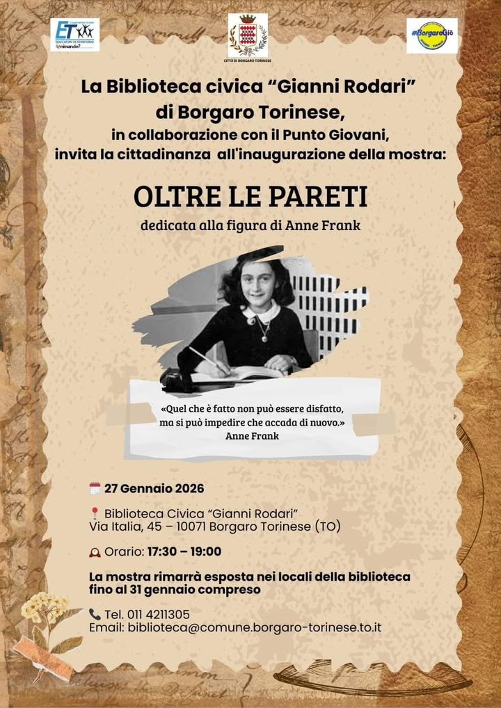 In occasione della Giornata della Memoria, lunedì 27 gennaio, la Biblioteca civica “Gianni Rodari”, in collaborazione con il Punto Giovani, invita la cittadinanza all’inaugurazione della mostra “Oltre le pareti”, dedicata alla figura di Anne Frank.