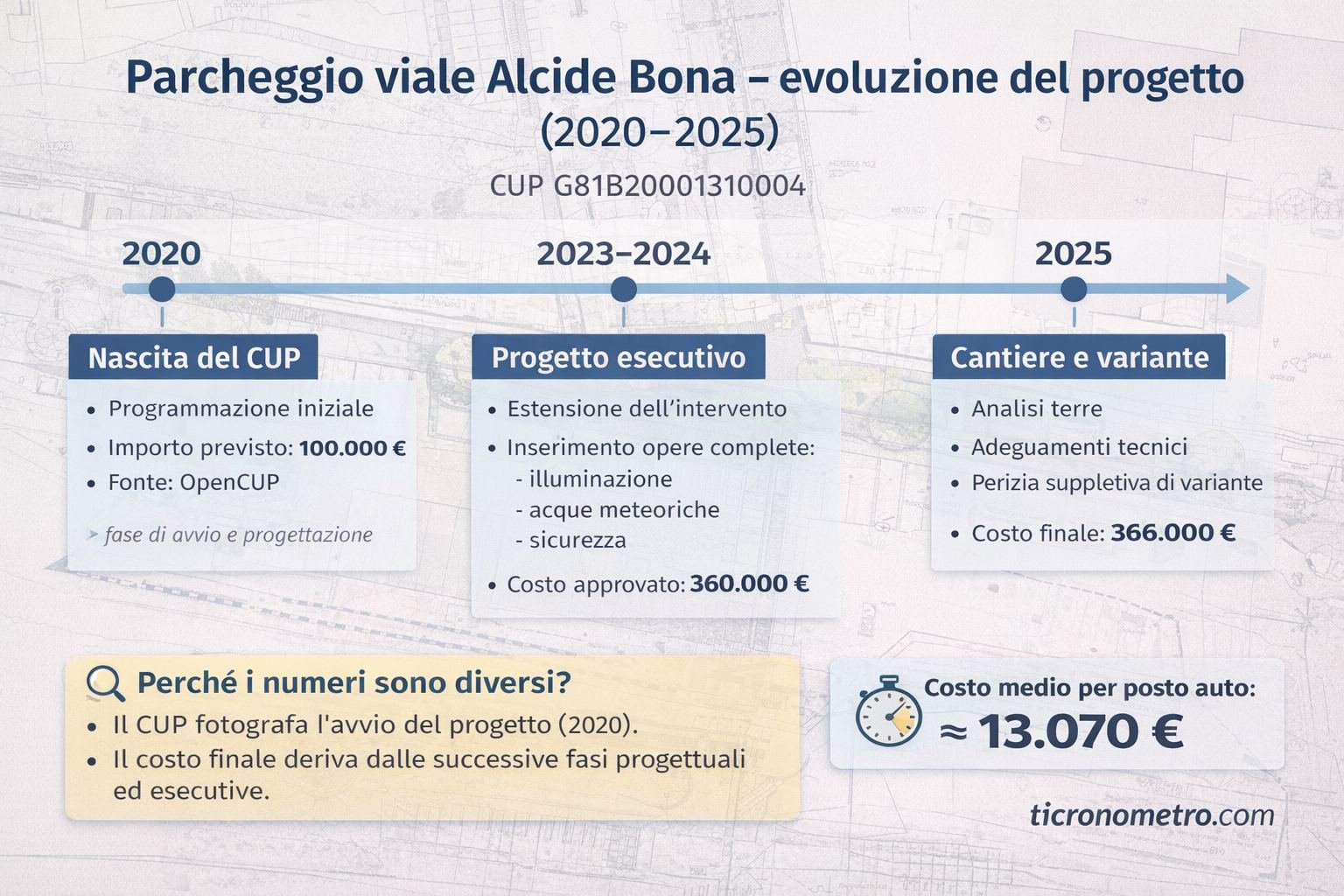 📌 Perché sul CUP risultano 100.000 € e il parcheggio ne costa 366.000?
