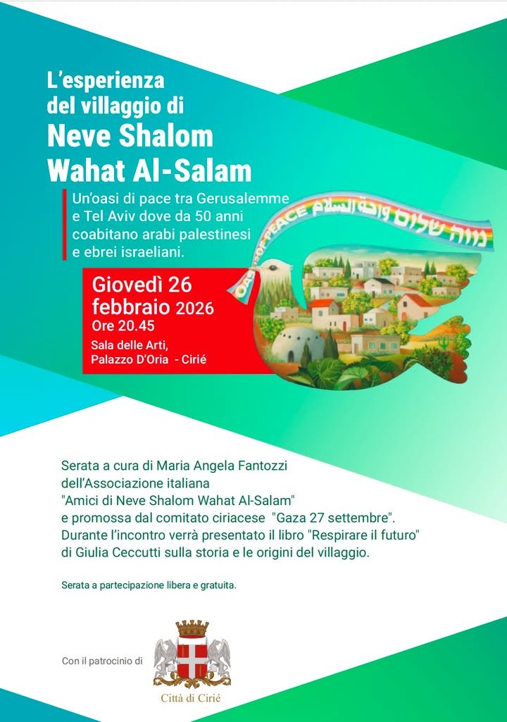 👉 Ricordiamo che domani sera, 🗓️ giovedì 26 febbraio, la 📌 Sala delle Arti di Palazzo D’Oria (piano terra, accanto all’Informagiovani, ingresso da via Dante) ospiterà l’appuntamento dal titolo “L’esperienza del villaggio di Neve Shalom Wahat Al-Salam”: si tratta di un villaggio tra Gerusalemme e Tel Aviv dove da 50 anni coabitano arabi palestinesi ed ebrei israeliani.