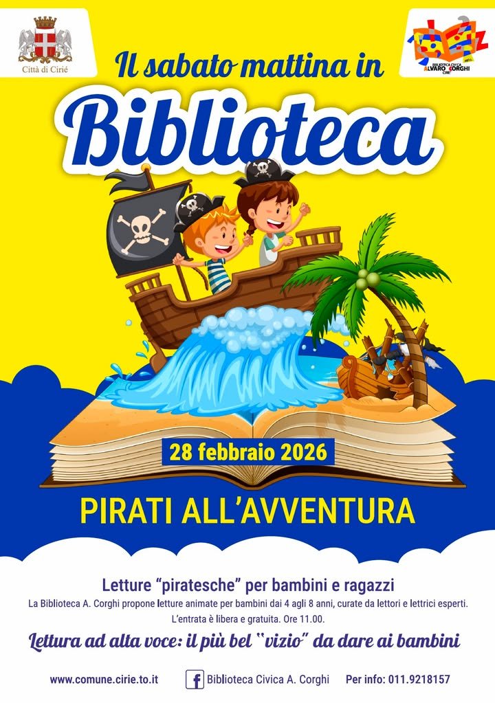 ๐Ÿ“– Per il ciclo โ€œIl sabato mattina in Bibliotecaโ€, le sale della Biblioteca A. Corghi di Ciriรฉ 2000 (al primo piano) aspettano bimbi e bimbe (dai 4 agli 8 anni) e le loro famiglie con letture animate a tema piratesco nella mattinata di sabato 28 febbraio.