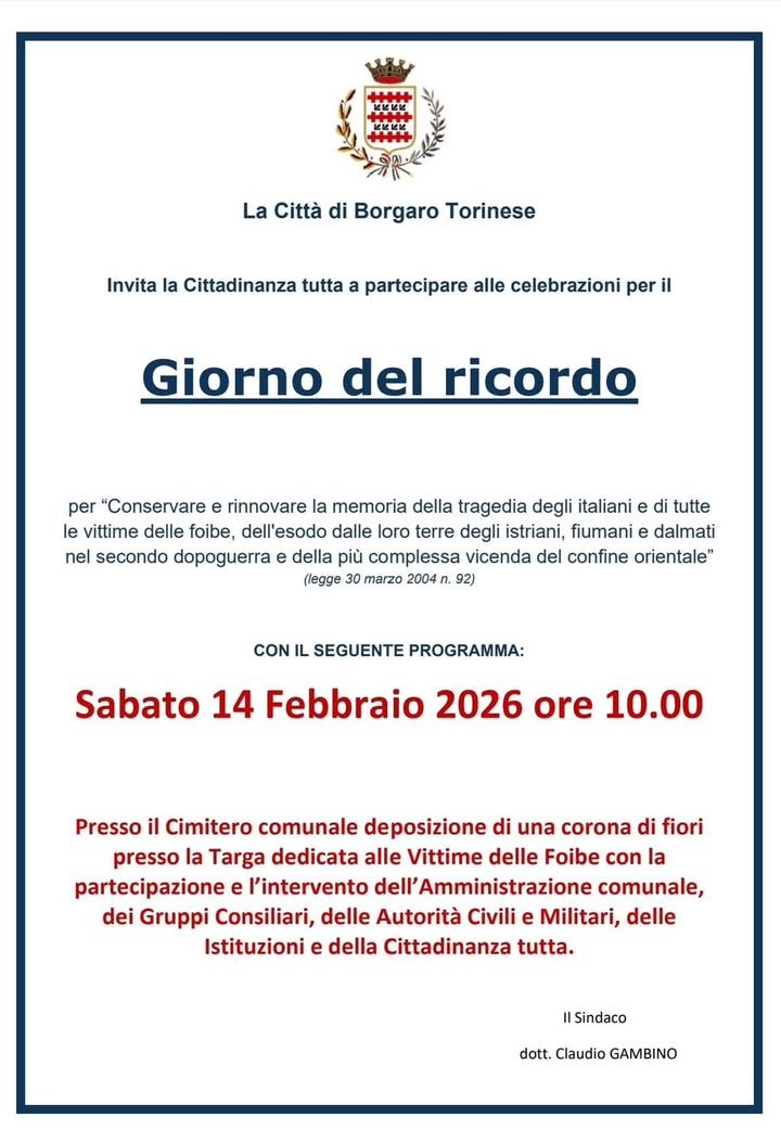 La Città di Borgaro Torinese invita tutta la cittadinanza a partecipare al momento commemorativo dedicato al Giorno del Ricordo, istituito per conservare e rinnovare la memoria della tragedia degli italiani e di tutte le vittime delle foibe, dell’esodo degli istriani, fiumani e dalmati e della complessa vicenda del confine orientale.