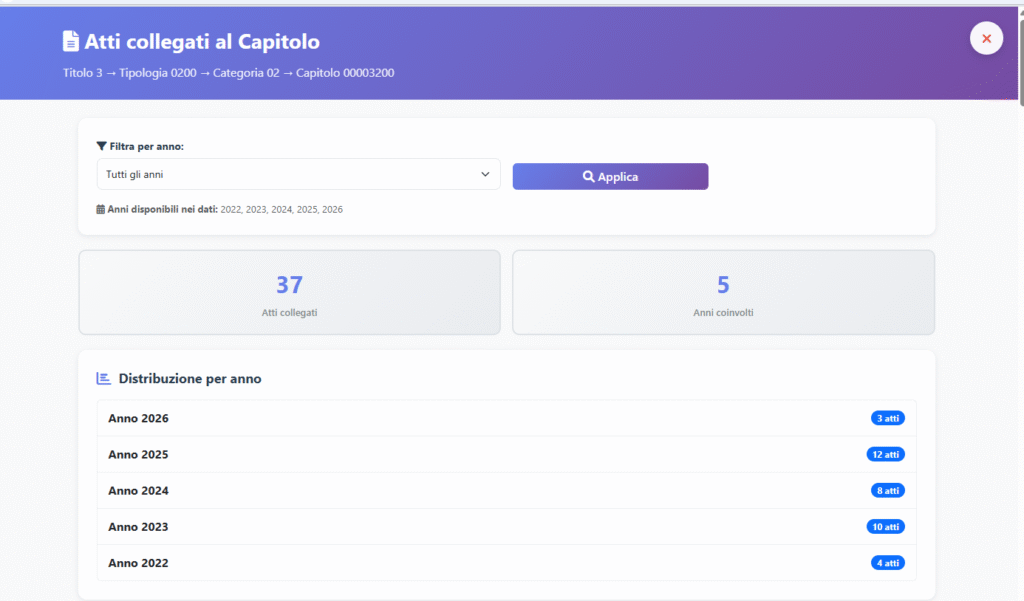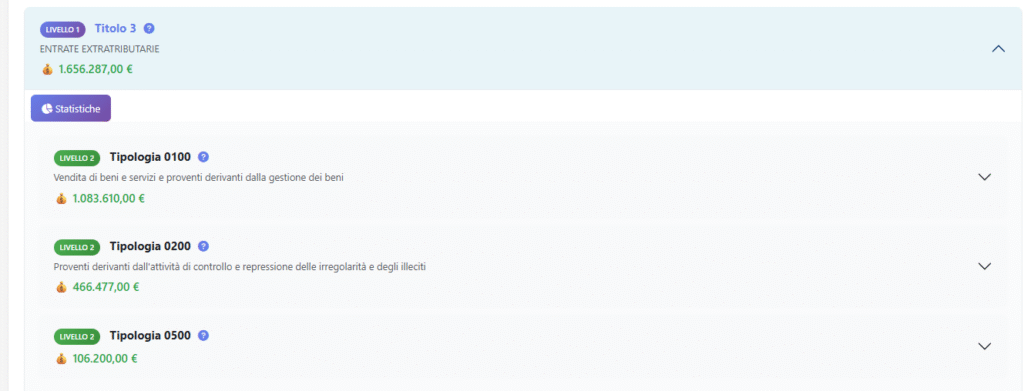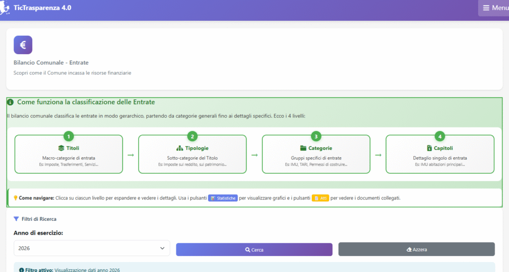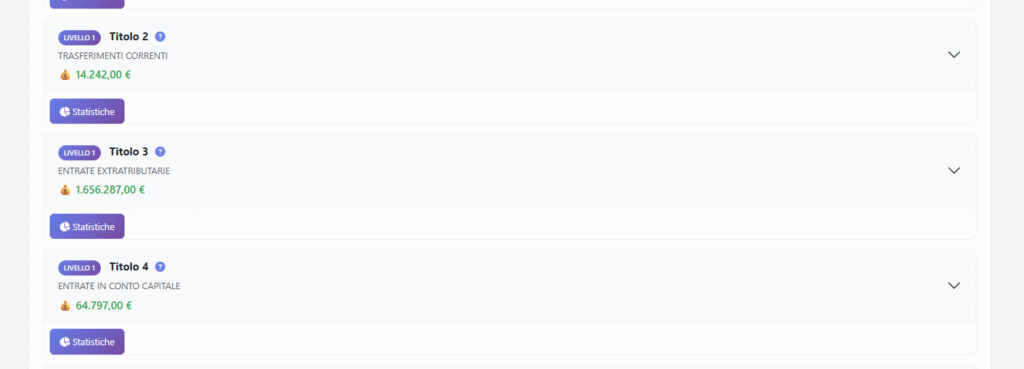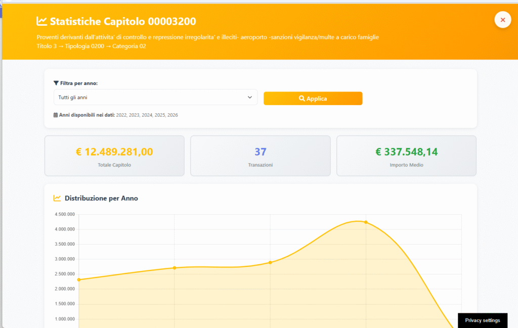 Anche in questa sezione è disponibile il filtro per anno. https://ticronometro.com/trasparenza_4/bilancio/visualizza_statistiche_titolo.php?titolo=3&anno=2026 a questo link potete vedere le statistiche del titolo 3 anno 2026 li vedrete i po la panoramica li potete scegliere i vari anni