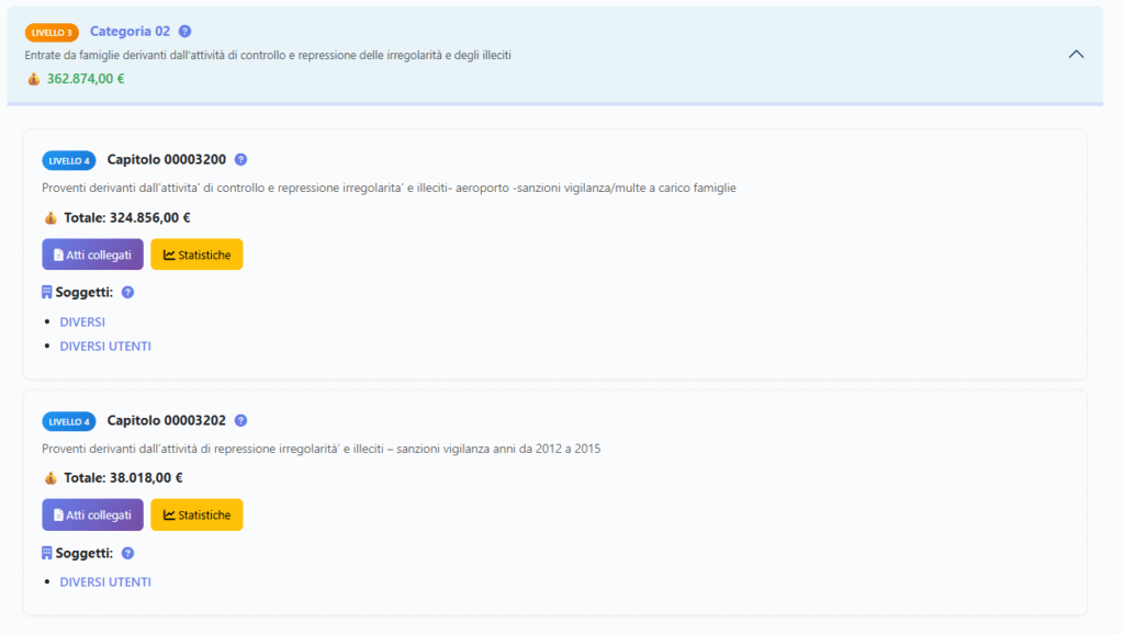 Nel caso dei proventi delle sanzioni, infatti, troviamo voci come “Diversi utenti”, proprio perché i versamenti provengono da soggetti diversi.