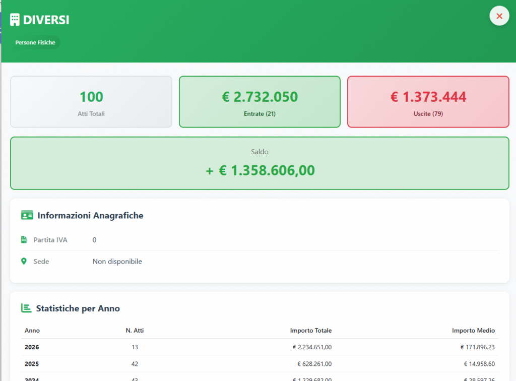 Il link per visualizzare la scheda aggregata del soggetto (o “fornitore”) questo tipo di scheda è più importante nel caso delle uscite in cui in una scheda mettiamo cifre atti e somme riferiti ad un fornitore (credetemi le schede fornitori sono fra le più viste di ticronometo e si una cosa del genere non la trovate altrove.