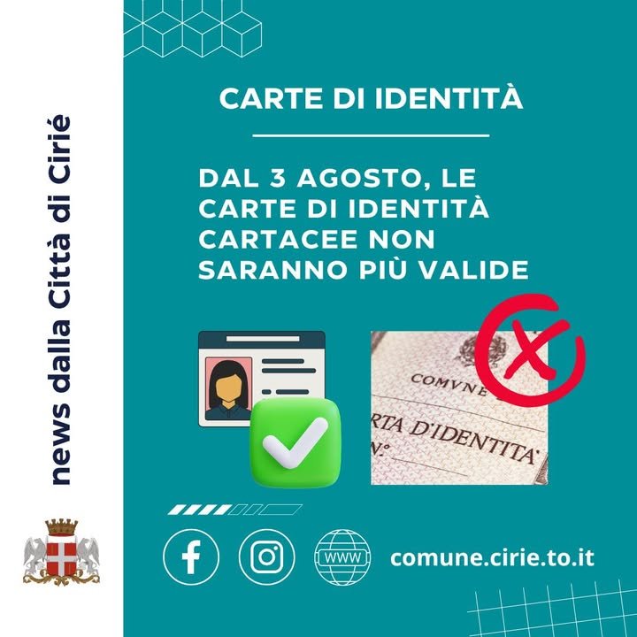 Invitiamo i ciriacesi che avessero ancora una carta di identitร cartacea a rivologersi allo ๐๐๐๐๐๐๐๐๐ ๐๐๐ ๐๐๐๐๐๐๐๐๐ di via A. D’Oria 14/7 (complesso Ciriรฉ 2000) per rifarla in formato elettronico.