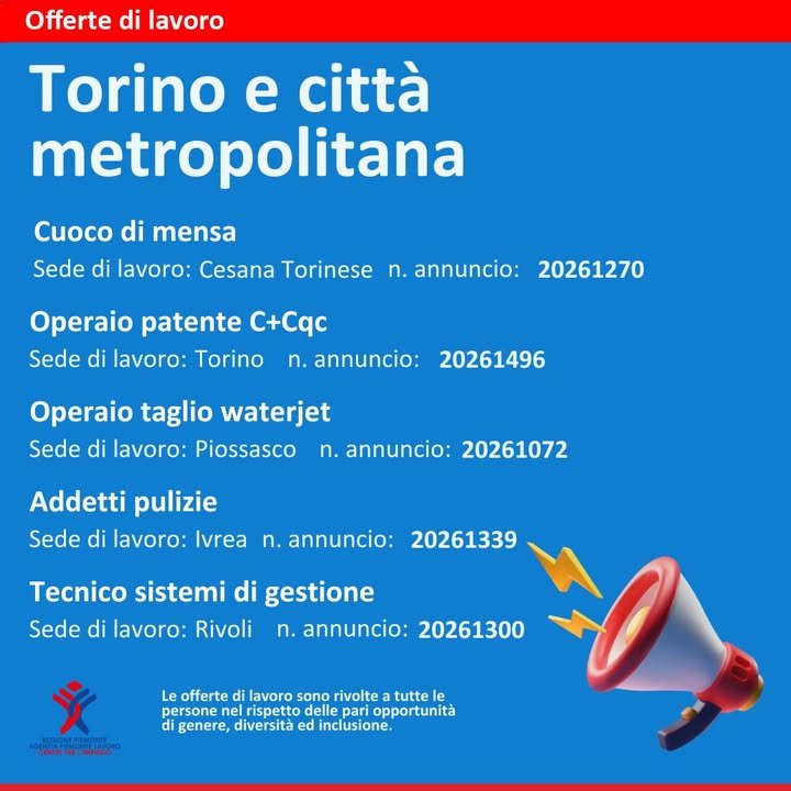 Se cerchi lavoro in un’altra zona del Piemonte consulta la vetrina degli annunci su Piemonte Tu, nell’area Incontro domanda e offerta: link alla vetrina degli annunci di Piemonte Tu.