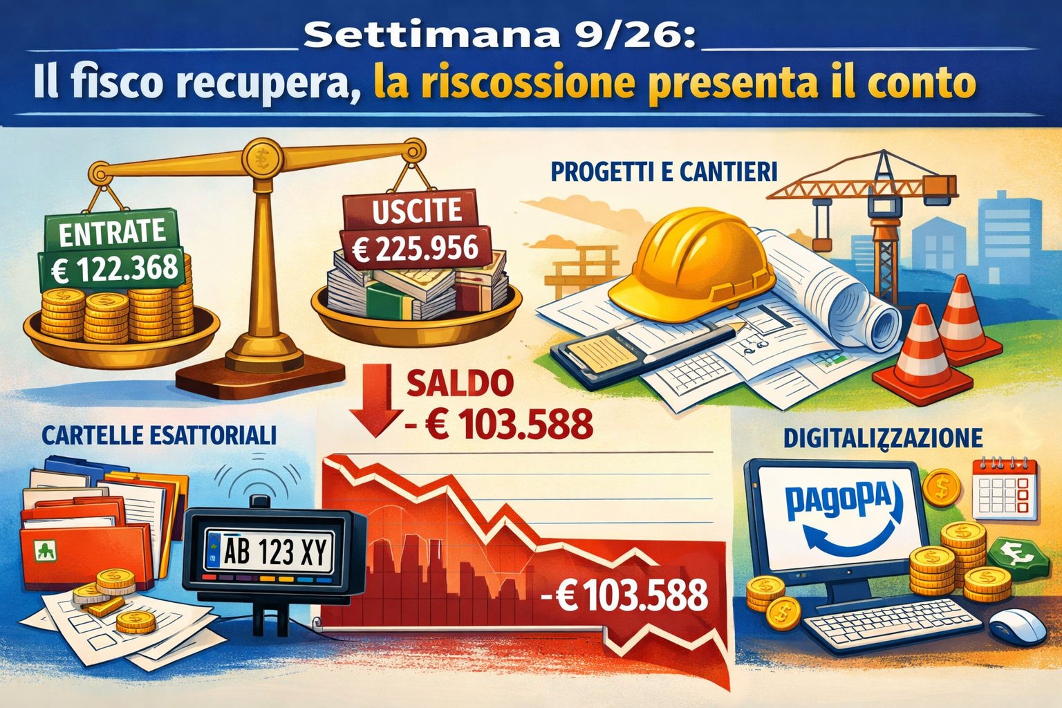 Qui la scena è chiara: tributi e accertamenti.