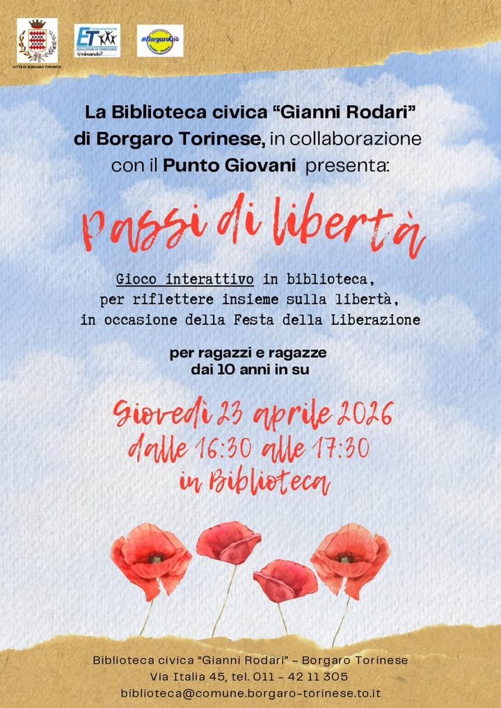 Giovedì 23 aprile Dalle 16:30 alle 17:30 la Biblioteca civica “Gianni Rodari” di Borgaro, in collaborazione con il Punto Giovani, propone un appuntamento dedicato ai più giovani per riflettere insieme sul valore della libertà, in occasione della Festa della Liberazione.