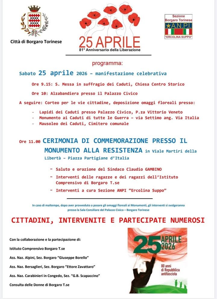 La Città di Borgaro invita tutta la cittadinanza a partecipare alle celebrazioni per il 25 Aprile, una giornata che custodisce la memoria della Liberazione dal nazifascismo e i valori di libertà, democrazia e pace su cui si fonda la nostra Repubblica.