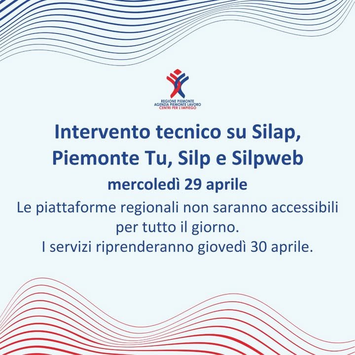 ⚠️ Mercoledì 29 aprile le piattaforme regionali Silap, Piemonte Tu, Silp e Silpweb non saranno accessibili per tutto il giorno a causa di un intervento tecnico.