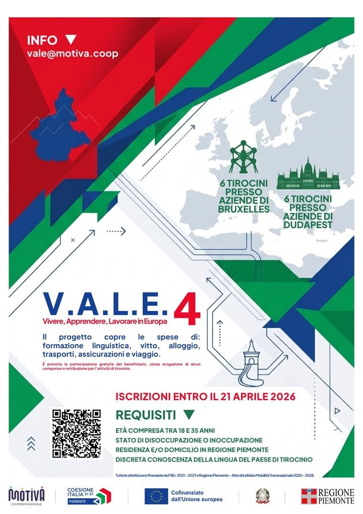 Il progetto, promosso dalla cooperativa Motiva s.c.s. e finanziato nell’ambito del PMT Mobilità Transnazionale della Regione Piemonte, mette a disposizione 24 tirocini in aziende europee rivolti a giovani disoccupati e/o inoccupati tra i 18 e i 35 anni, domiciliati in Regione Piemonte.